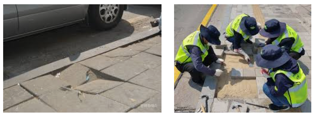 22. 보도블럭이 파손되었을때는 보도블럭을 깔기전에 모래를 기존의 높이보다 조금 높게 쌓고 새 보도블럭을 시공해야합니다. 그래야 사람들이 밟으면 밟을수록 내려앉아 기존 보도블럭과 높이가 같아질 수 있습니다.